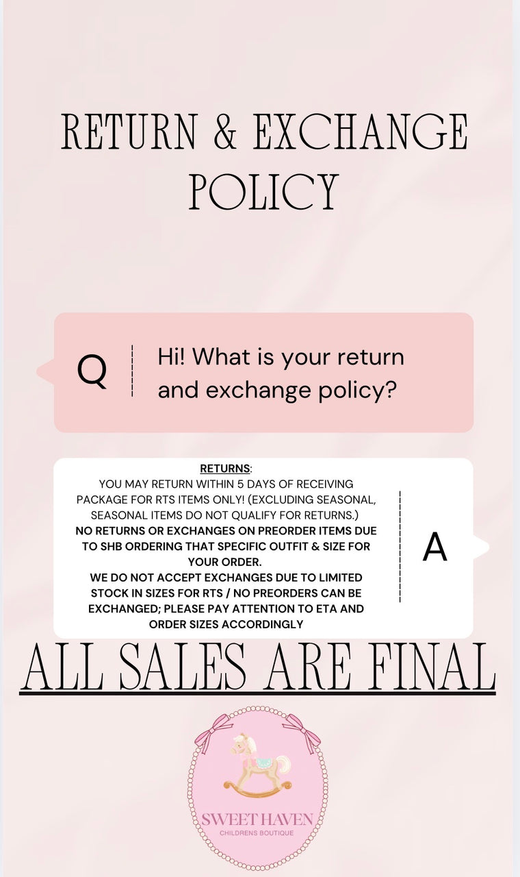 Welcome to Sweet Haven Boutique! My name is Taylor Hamby and I am the owner + founder of SHB! I am a mama to my sweet Stetson Allen and a step mama to my beautiful Gemma Gail. In 2024, we welcomed our baby boy into this world and fell absolutely head over heels. After buying more clothes than I could fit into his closet, I decided to open a children's boutique where I could offer good quality clothing at an unbeatable price, because let's be honest, our littles are only gonna wear that "OMG I have to have this outfit" maybe 2 times! I wanted to offer this to my hometown and pour into them as they have so graciously poured into my business. Since then we have shipped out in many states in the USA and we are so grateful. Above all, I would be nothing without our God. He has blessed me in so many ways and I am forever grateful for all the opportunities He continues to put in my path. I hope you enjoy and love our clothing as much as we do and thank you for shopping with SHB!