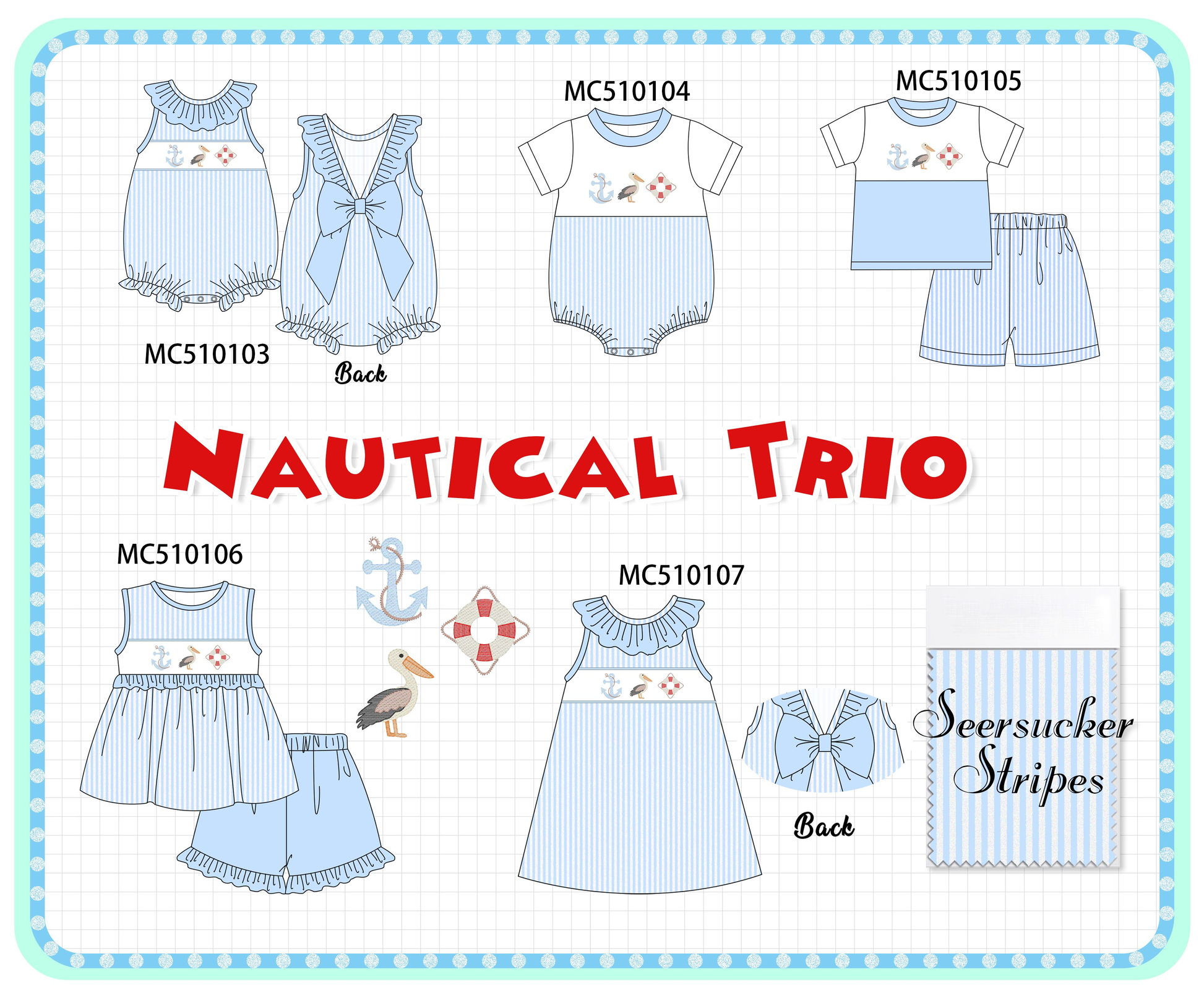 This playful Blue Nautical Trio Embroidery Stripe Collection features a fun, summery design perfect for siblings who love to match. Made from a soft blend of 95% cotton and 5% spandex, it offers comfort with just the right stretch. Ideal for family outings or beach days, these cute stripes bring a fresh, coordinated style that everyone will enjoy.